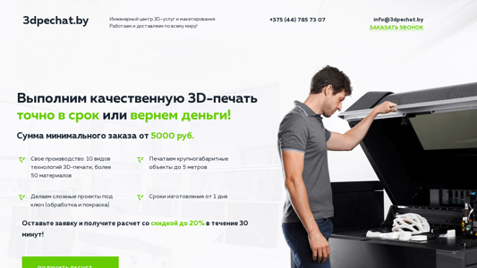 | AI-анализ | The portal is a 3D printing service in Misnke, offering custom 3D printing with a quality guarantee and the lowest prices. The website, 3dpechat.by, is an engineering center for 3D services and modeling. They work and deliver worldwide. Users can place an order and receive a quote with a discount of up to 20% within 30 minutes. The minimum order size is 5000 rubles. The company offers ten types of 3D printing technology and over fifty materials. They can produce large-scale objects up to 5 meters in size and handle complex projects with processing and painting. Production times range from one day. Users can submit a request for a quote and receive a customized solution for various tasks such as cost savings, creating a real object for presentations or exhibitions, quickly developing and testing new products, or creating unique products not available on the market. |