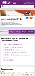 | Название / Заголовок | Автобусный парк №1 филиал ОАО Гомельоблавтотранс - Туристические услуги. Грузоперевозки. Пассажирские перевозки. Диагностическая станция. Ремонт и сервисное обслуживание транспортных средств.. 246043, Гомель, , Барыкина, 134 |