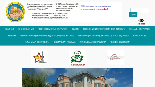 | AI-анализ | --- This online resource is a state institution named "Дуниловичский социальный пансионат "Троицкий"" located in Поставский район, Витеbская область, at ul.Дворовая 1/18, хутор Новые Ясневичи. It provides social services and accommodations for citizens and legal entities. The website includes sections on the administration of the pension, its history, a reference guide for making inquiries and submitting applications, the rules for personal meetings with the leadership, and various legal acts related to the institution. There are also direct phone lines and electronic forms for submitting requests. The website also features information on humanitarian projects, such as "Мир доступен для всех", "Здоровое питание — залог сохранения здоровья", and "Уютный мир для на |