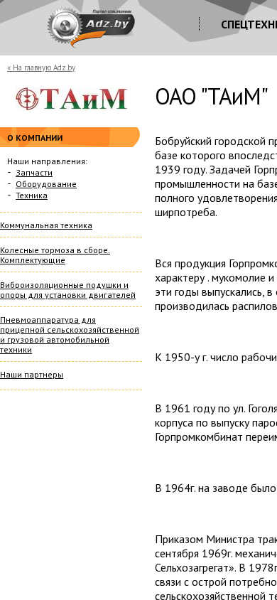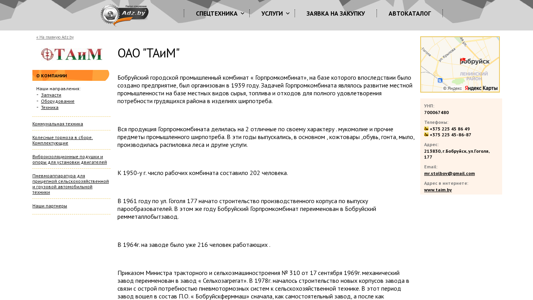 | AI-анализ | This website is for ОАО "ТАиМ" (TAIM), a Belarusian company specializing in machinery and equipment, spare parts, services, rental, and credit/leasing for agricultural and construction machinery, as well as cargo transportation. The company was established in 1939 as part of the Bobruisk city industrial complex, with a focus on utilizing local resources to produce consumer goods. Initially, the complex produced textiles, footwear, roofing materials, soap, and provided sawmill services. By the 1950s, the workforce had grown to 202 people. In 1961, construction began on a production facility for producing par boilers, and the Bobruisk Industrial Complex was renamed the Bobruisk Metalworking Plant (remmeталлобытзавод). In 1969, the mechanical factory was renamed as " |