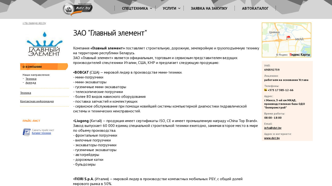 | AI-анализ | The portal ZAO "Glavny Element" is a Belarusian business-to-business website offering construction, road, earth moving, and heavy lifting equipment for sale and rental in Belarus. The company, ZAO "Glavny Element," is the official, trading, and service representative of leading international equipment manufacturers from the United States, Italy, and China. The website provides information on the following products: 1. Bobcat (USA) - a world leader in mini-excavators, telehandlers, and over 80 types of attachments. They offer parts and service support using the latest computer diagnostic system for hydraulic systems and technical faults. 2. Liugong (China) - a manufacturer with ISO, CE certifications and a "China Top Brand" award. They produce 60,000 units of specialized construction equipment annually, |