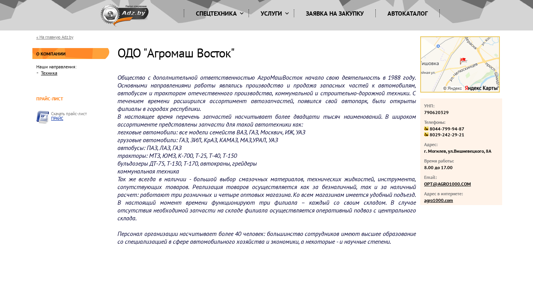 | AI-анализ | language: ru The website "ОДО «Агромаш Восток»" is an e-commerce platform specializing in the sale of spare parts, equipment, and services related to various types of machinery and vehicles. The company, which began operations in 1988, offers a wide range of products including parts for domestic cars, buses, and tractors, as well as construction and road machinery. The inventory includes more than 20,000 part names and spans various brands such as VAZ, GAZ, Moscow, IZH, UAZ, Gaz, Paz, Laz, MTZ, Yumz, K-700, T-25, T-40, T-150, bulldozers DT-75, T-130, T-170, cranes, graders, and |