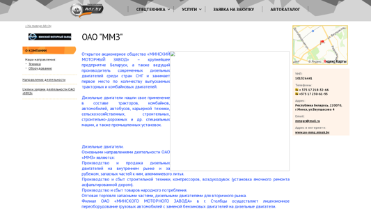 | AI-анализ | The portal mmz.adz.by is the website of Open Joint Stock Company "Minsk Motor Plant" (OAO "ММЗ"), the largest Belarusian enterprise and leading producer of modern diesel engines among CIS countries. Diesel engines are used in tractors, harvesters, vehicles, buses, construction machinery, agricultural and industrial equipment, and power installations. The company's main activities include the production and sale of diesel engines and spare parts for them, as well as aluminum casting. Additionally, they produce and sell construction equipment, compressors, and pneumatic tools, and trade in secondary market diesel engines and spare parts. A filial of OAO "ММЗ" in Stolbtsy performs license conversion of cargo trucks by replacing gasoline engines with diesel engines. The company also engages in foreign economic activity and provides warranty and service |