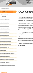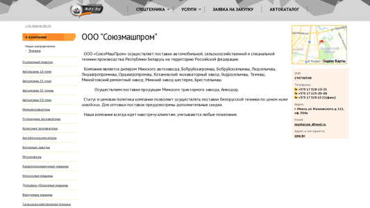 The website of OOO "Союзмашпром" (<https://souzmashprom.adz.by>) is a Belarusian online resource specializing in the sale and distribution of Belarusian-made machinery and equipment. The company acts as a dealer for various Belarusian manufacturers, including Minsk Auto Plant, Bobruiskagromash, Bobruiskselmash, Lidselmash, Lidagroprommash, Orshagropromash, Kohanovsky excavator plant, Gidroselmash, Techmas, Minotovsky repair plant, Minsk gearbox plant, and Brestselmash. The website offers a price list for Belarusian-made machinery and equipment, which can be downloaded from the website. The company offers lower prices than the manufacturers due to its status and pricing policy