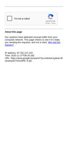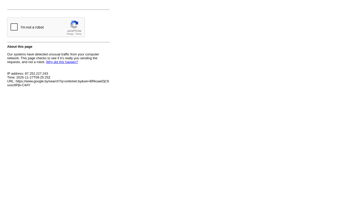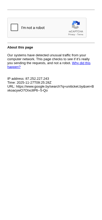 | AI-анализ | This online resource is a search results page from Google for the query "uniticket.by". The page contains information about a website named Uniticket, which is likely a ticketing service based on the keyword data. The page includes a CAPTCHA verification system to prevent automated requests and potential violation of Google's terms of service. The IP address associated with the request to this page is 87.252.227.243 and the time was 2025-11-27T09:25:25Z. The domain of the page is mail.gmail.com. |