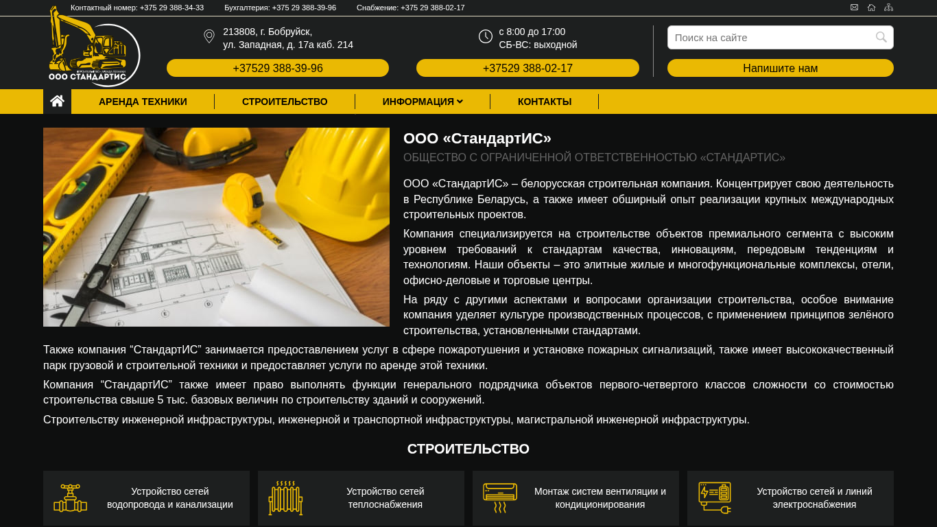 The portal OOО СтандартИС is a Russian-language Belarusian business website. It provides information on renting various types of equipment and services in Bobruisk and Minsk, including excavators, tractors, construction and sanitation works, and installation of water, electrical, and ventilation systems. The website offers contact details for the company and a search function for users to look up specific services. The site is optimized for keywords such as "minsk аренда техники," "бобруйск аренда техники," "аренда техники рб," and "аренда техники бобруйск." The website was last modified on September 9, 2020.