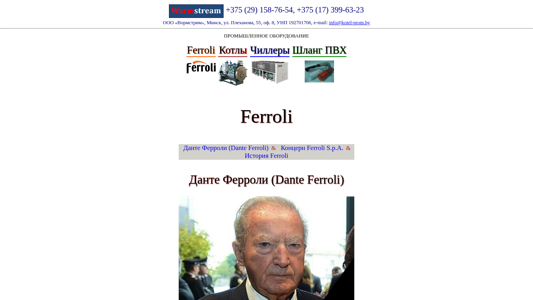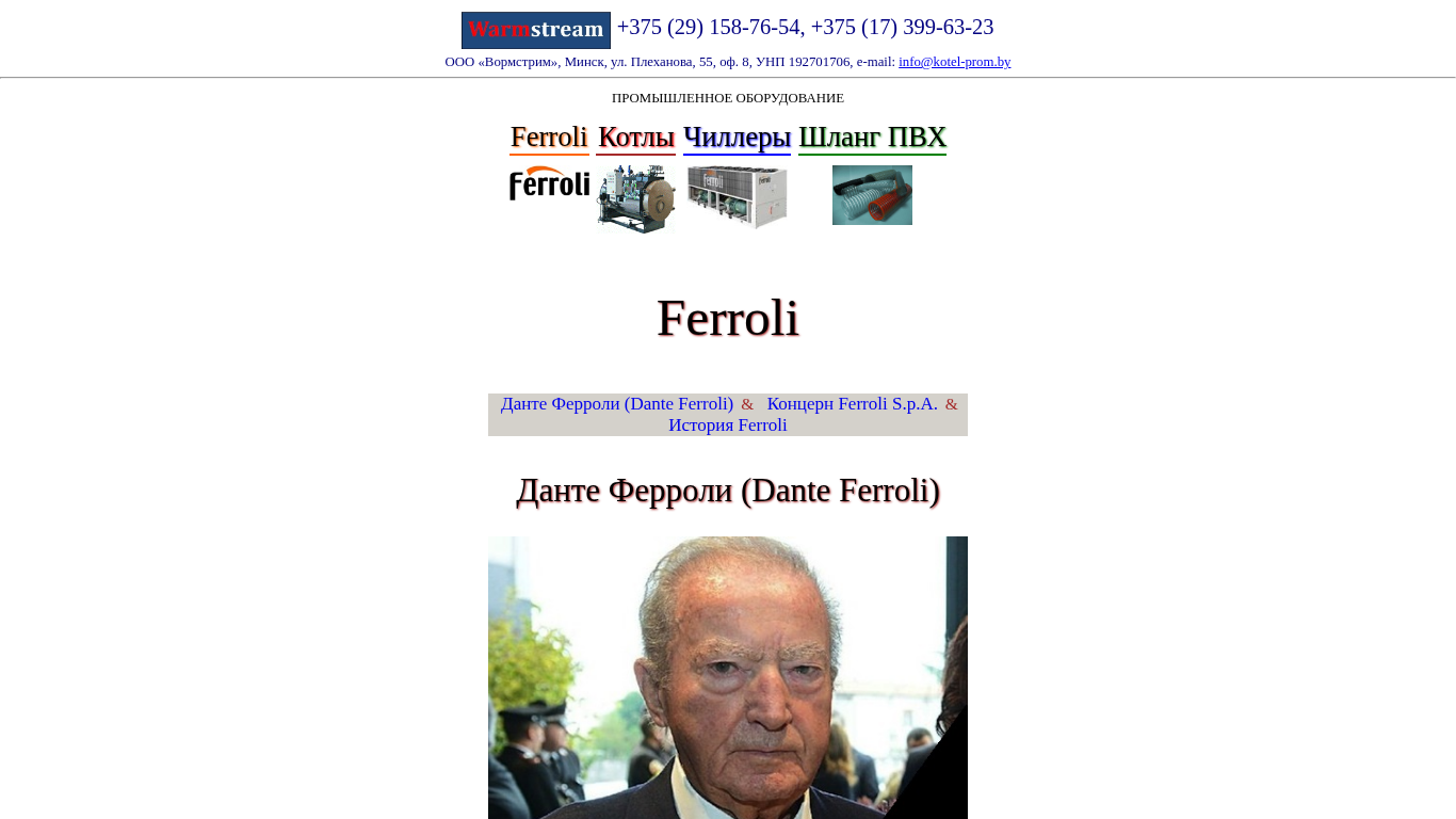 | Название / Заголовок | FERROLI Минск - Умер "Рыцарь Котлов" Данте Ферролли (Dante Ferroli), президент и основатель Концерна Ferroli S.p.A. |