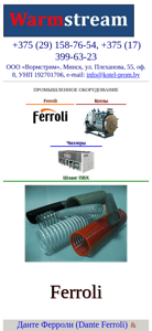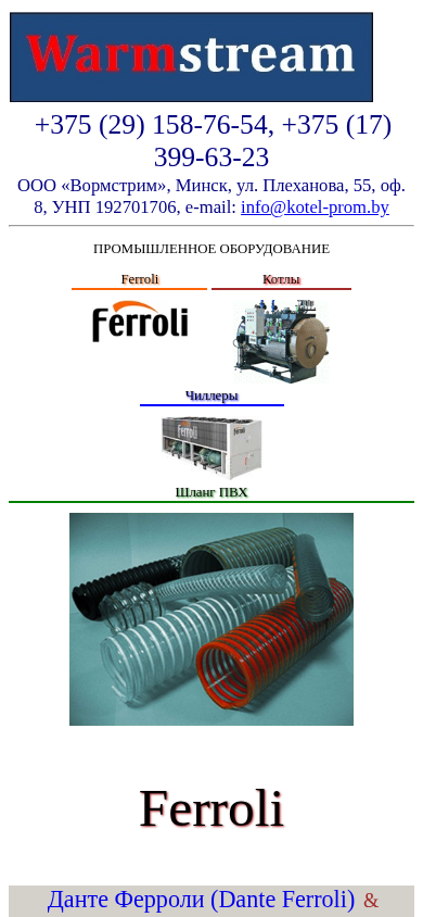 | Адрес | основатель Концерна Ferroli S.p.A., +375 (29) 158-76-54, +375 (17) 399-63-23, ООО «Вормстрим», Минск, ул., Плеханова, 55, оф. 8 |