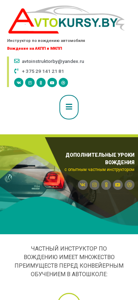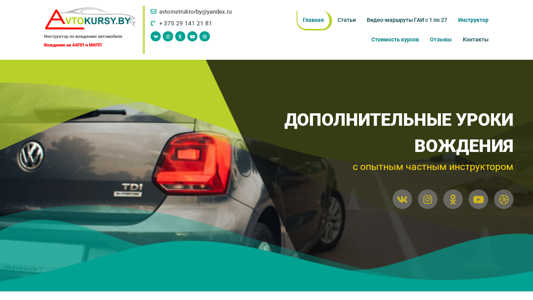| AI-анализ | This website is an auto instructor's page in Minsk, Belarus, named after Valeriy Kulagin. The site offers driving lessons on both automatic and manual transmissions, as well as practice routes for the traffic police. Visitors can contact the instructor using the provided phone number. The page includes sections for articles, videos, pricing, testimonials, and additional driving lessons with an experienced private instructor. The benefits of private instructor-led training compared to school-based learning include a more efficient learning process, the ability to choose one's own practice routes, and the instructor's personal investment in a successful outcome to maintain their reputation. Driving lessons can be scheduled under various weather conditions and at different times of the day. The cost for 1.5 hours of instruction is 115 BYN. |