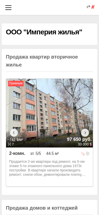 | AI-анализ | This online resource is a real estate agency website named "Империя жилья" (Empire of Housing). It specializes in the sale of second-hand apartments and houses. The website provides information about two specific properties. The first property is a second-hand apartment located on the fifth floor of a five-story panel house built in 1973. The apartment is undergoing renovation, with flooring and tiles removed and construction debris taken out. It has separate rooms and windows facing both sides, making it a warm and spacious living space. The total living area is 44.5 square meters, with 28 square meters for the living quarters and 6 square meters for the kitchen. The apartment is not corner, and it comes with a balcony. The building has undergone a complete repair, and the yard is well-maintained with a new children's playground. |