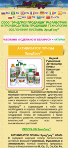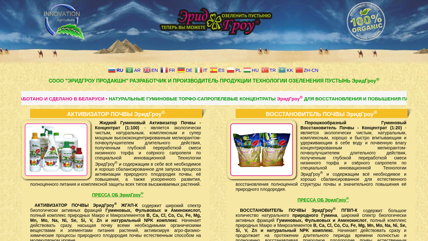 | Ключевые слова | технология озеленения пустынь гуминовые концентраты эридгроу микроудобрения биостимуляторы роста мелиоранты почвоулучшители активизатор почвы восстановитель почвы сорбент нефти и нефтепродуктов |