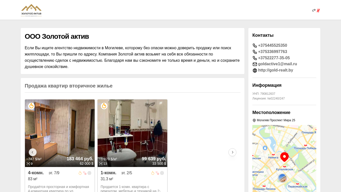 | SEO-описание | Если Вы ищите агентство недвижимости в Могилеве, которому без опаски можно доверить продажу или поиск жилплощади, то Вы пришли по адресу. Компания Золотой актив возьмет на себя все обязанности по осуществлению сделок с недвижимостью. Благодаря нам вы сэкономите не только время и деньги, но и сохраните душевное спокойствие. |