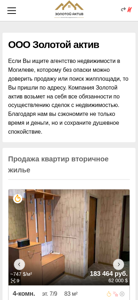 | AI-анализ | The web project "ООО Золотой актив" (Company Golden Active) is an real estate agency based in Mogilev, Belarus. The company offers full responsibility for real estate transactions, allowing clients to save time, money, and peace of mind. The agency specializes in the sale of various types of real estate, including second-hand apartments, commercial properties, and new construction. The provided data includes a listing for a 4-room, 83 square meter apartment located on Ulitsa Kastanovaya 7, priced at 747 US dollars per square meter, and a 1-room, 31.3 square meter apartment priced at 1,070 US dollars per square meter. The agency is registered under UNP 790812637 and holds a real estate services contract and a ministry license. The agency's |