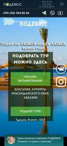 | AI-анализ | This website is an online travel agency named "Подевюс" that offers bus and train tours from Minsk, Belarus. The company provides affordable prices for their bus and train tours, with an option to book online and choose a tour with a beach vacation. The company's name and contact information, including a phone number, are repeated multiple times throughout the website. The website also includes icons for Svg Vector Icons, which can be accessed at a specific URL. The company offers tours to various destinations including Bulgaria, mountain resorts in Russia and Poland, and exotic locations such as Turkey, Egypt, and the United Arab Emirates. The website also mentions New Year's Eve tours to these destinations. The company's tagline is "ПОДЕВЮС Отдых на любой вкус в любое время года" which translates to "По |