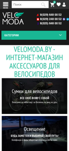 | AI-анализ | --- The portal Velomoda.by is an online shop specialized in accessories for bicycles based in Minsk, Belarus. The website offers the lowest prices on bicycle accessories with delivery available in Minsk and throughout Belarus. The product range includes various types of accessories such as wheels, handles, pumps, bags, locks, and computer systems for bicycles. Brands like Xiaomi, Kugoo, M365, Rockbros, and Mijia are represented in the catalog. The website also features a blog, personal cabinet, registration and authorization, shopping cart, and contact information for customer support. The catalog consists of various categories including bike bags, accessories for bike bags, bike computers, protective clothing, and bike parts. The website also offers a repair and maintenance section. |