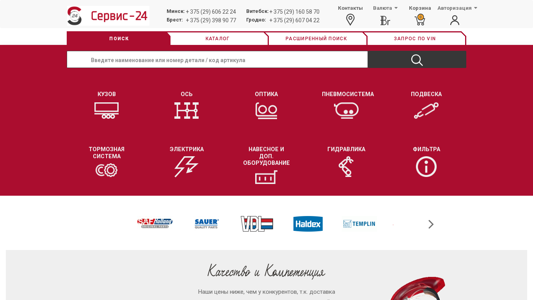 | AI-анализ | This website is an e-commerce platform specializing in the sale and repair of parts for heavy-duty transportation vehicles. The title of the website is "Servis-24" and the description mentions "запчасти и ремонт грузового транспорта" (spare parts and repair for heavy-duty transportation). The keywords include product, submit-availability, js, config, and various vehicle parts such as suspension, brakes, and electrical components. The top_words list consists of product groups related to vehicle components, including body parts, suspension, brakes, and electrical systems. The website offers phone numbers for various Belarusian cities, and the language is set to Belarusian with English as an option. The website uses Google Analytics and has a shopping cart feature. The catalog includes various vehicle parts and accessories, organized by category and sub-category, such as body parts |