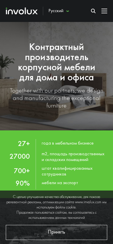 url: / The web project Involux is a furniture company based in Belarus. It specializes in producing and selling furniture for offices, homes, and hotels. Involux is a leading company in the furniture industry in the CIS and Europe. The furniture produced by Involux is present in the interiors of hundreds of establishments. Keywords related to the project include 'furniture,' 'office,' 'home,' and 'hotel.' The company has production and storage facilities covering 27,000 square meters, allowing it to manufacture over 2,000 tons of furniture monthly, with nearly 90% of it being exported to countries in the CIS and Europe. Involux has been in business for over 27 years and employs over 700 qualified staff. The company uses laminated chipboard and MDF, as well