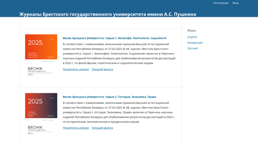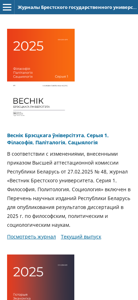 | AI-анализ | The website is the online home of the academic journals published by Brest State University named after A.S. Pushkin. The site features four series of journals: Philosophy, Political Science and Sociology (Series 1); History, Economics and Law (Series 2); Philology, Pedagogy and Psychology (Series 3); and Physics and Mathematics (Series 4). According to a decree from the Higher Attestation Commission of the Republic of Belarus issued on February 27, 2025, these journals have been included in the List of Scientific Publications of the Republic of Belarus for publishing the results of dissertations in their respective fields in 2025. Users can view the latest issues of each journal on the site. |