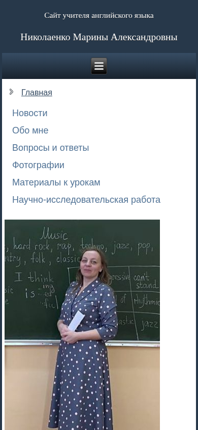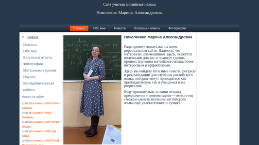 | AI-анализ | The website is a personal educational site by Marina Nikolayenko, a graduate of the Minsk State Linguistic University in 2005, specializing in... The site offers various resources and recommendations for learning English, including helpful tips, FAQ sections, and photo materials. It also features sections for each grade level, such as "Unit 9. I love animals." and "Unit 8. Seasons.", where educational materials are provided. Users can also access "Obo mne" (About me), "Вопросы и ответы" (Questions and Answers), and "Фотографии" (Photographs) sections. Additionally, the site offers "Материалы к урокам" (Materials for lessons), which can be downloaded, and a "Научно-исследовательская работа" (Research project) section. |