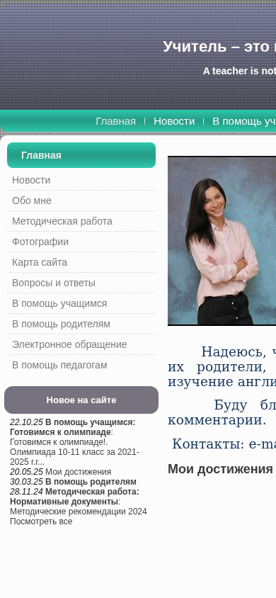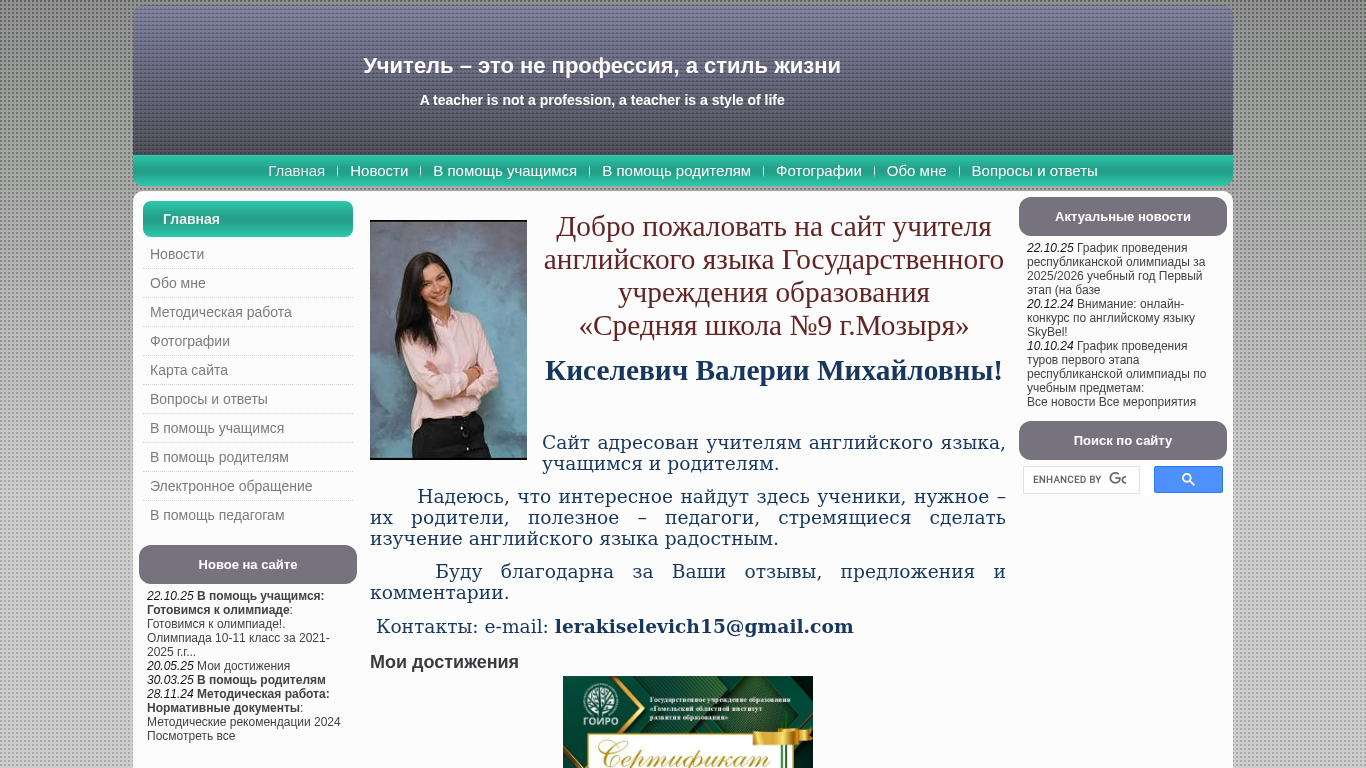 | AI-анализ | The web project "kis-val-english.lepshy.by" is a website for Valeria Kiselewich, a teacher of English at Middle School No.9 in Mozir, Belarus. The site provides news, helpful resources, and information for students, parents, and educators. Topics include preparation for Olympiads, teaching methods, and educational documents. The site also features a photo gallery and an electronic contact form. The main page includes links to recent news, such as the graphical representation of the schedule for the republican oliympiad and an online English language competition called SkyBel. The site is organized into sections, including "News," "About Me," "Methodical Work," and "Questions and Answers." The site also includes a site map and a search function. The title of the site is "Учитель английского языка Киселевич |