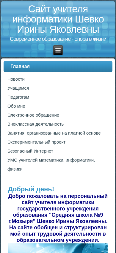 | AI-анализ | The web project is a personal site of Irina Yakovlevna Shevko, a computer science teacher at State Educational Institution "Mozir Middle School No. 9". The site collects and structures her professional experience in the educational sector. In the 21st century, the role of a teacher in the information culture is changing, requiring modern methods and new educational technologies to communicate effectively with students. The site includes information on ongoing events, such as the "Infomysheka" competition for students in computer science, as well as Irina's publications in various academic conferences and educational forums. Additionally, there is a section for the United Methodological Association of teachers of mathematics, physics, and informatics, and a section for students with normative legal acts. The site also offers paid workshops and experiments on safe internet use. |