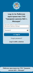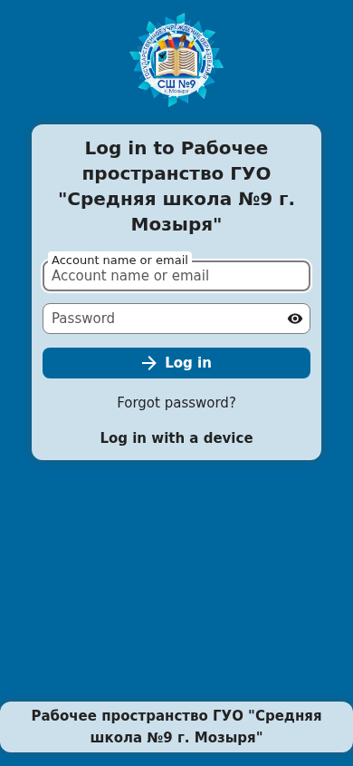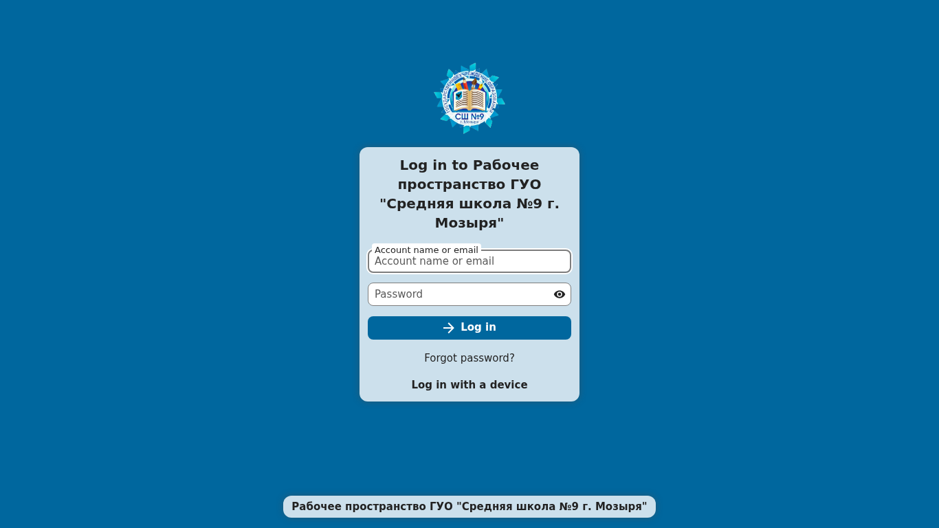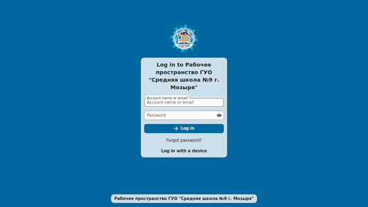 | AI-анализ | This website is a login page for the "Рабочее пространство ГУО "Средняя школа №9 г. Мозыря"" (Work space of the State Educational Institution "Middle School #9, Mozyr"). Users must enable JavaScript and enter their account name or email and password to access the application. The page also provides a link for users to recover their password. Users can log in using a device as well. |