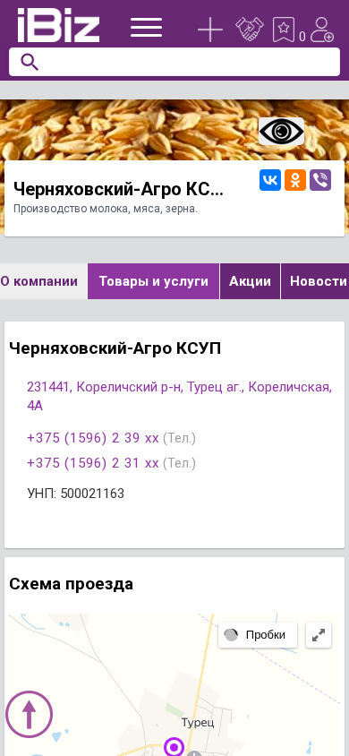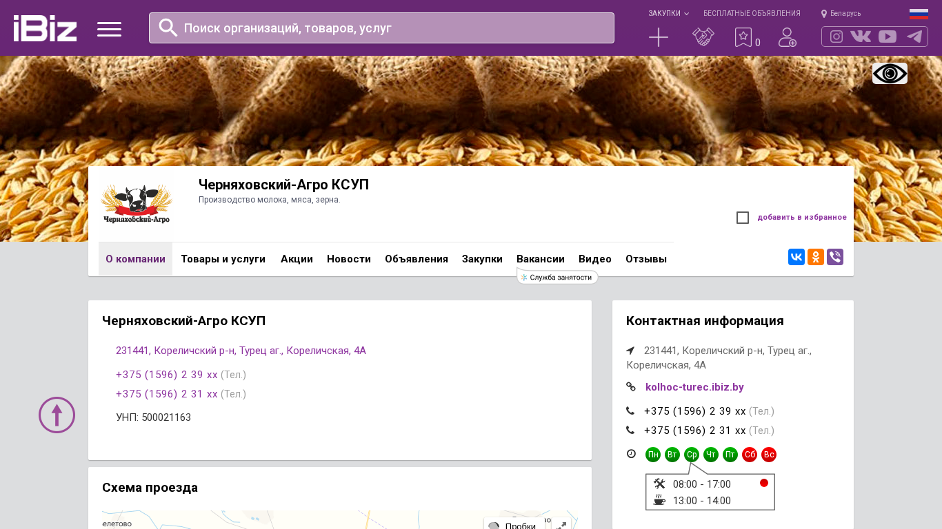| AI-анализ | This website is for Chernaykhovsky-Agro KSUP, a farming enterprise located at Turec Agricultural Cooperative, Korolevskaya Street 4A in the Corelichsky District, 231441, Belarus. The company specializes in the production of milk, meat, and grain, with key product categories including poultry breeding of Landrace and Yorkshire pigs, dairy farming for milk and beef cattle, and crop production of sugar beet, rapeseed, and corn. Contact information for the company includes phone numbers +375 (1596) 2 39 xx and +375 (1596) 2 31 xx. Business hours are Monday to Friday from 8:00 AM to 5:00 PM, with a break from 1:00 PM to |