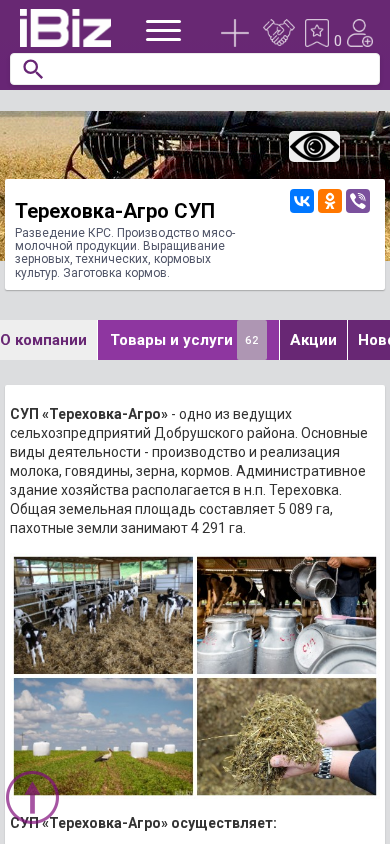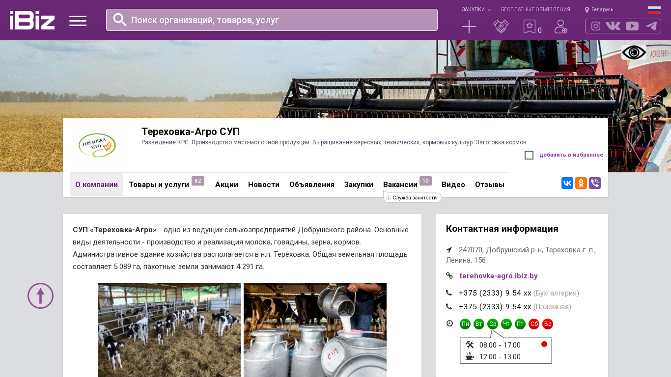 | AI-анализ | --- The website <www.terehovka-agro.ibiz.by> is dedicated to Terekhovka-Agro CUP, a leading agricultural enterprise in Dobruschy district, Belarus. The main activities include the production and sale of milk, beef, grains, and feeds. The company owns a total land area of 5,089 hectares, with 4,291 hectares used for farming. Terekhovka-Agro CUP operates four combined thermal and mechanical farms, cattle farms, a large transportation fleet with cargo, tractor, and agricultural machinery, workshops, storage facilities, and administrative buildings. The herd size is 3,450 heads, with 1,041 of them being dairy cows. The website does not provide information on contact details or a map for reaching the company. However, |