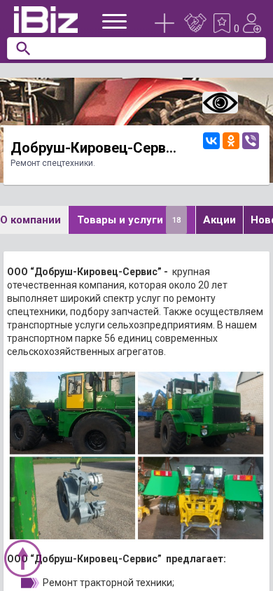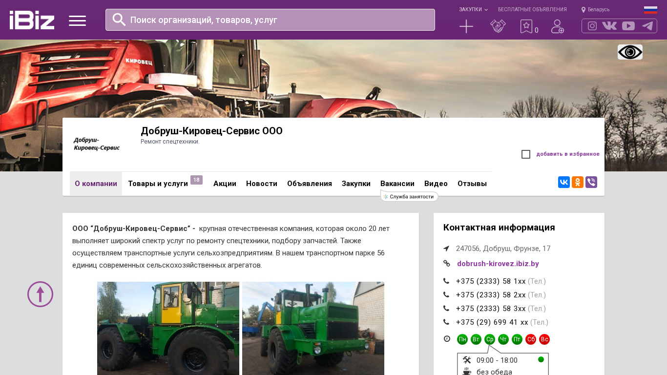 | AI-анализ | The portal Dobrush-Kiroveц-Service OOO is a Belarusian company based in Dobrush, Minsk Region, offering repair services for specialized machinery and trucks. The company's address is Фрунзе, 17, and it provides a map, contact numbers, and schematic route for visitors. The main keywords associated with the site are "ремонт" (repair), "услуги" (services), "375" (Belarusian country code), "тел" (telephones), "техники" (technology), "ооо" (limited liability company), "спецтехники" (specialized machinery), "закупки" (purchases), and "объявления" (announcements). The company offers repair services for tractors, AMKODOR machinery, and modernization of agricultural equipment |
