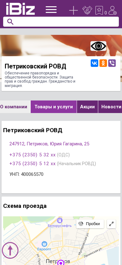 | Название / Заголовок | Петриковский РОВД - Обеспечение правопорядка и общественной безопасности. Защита прав и свобод граждан. Гражданство и миграция.. 247912, Петриков, , Юрия Гагарина, 25 |