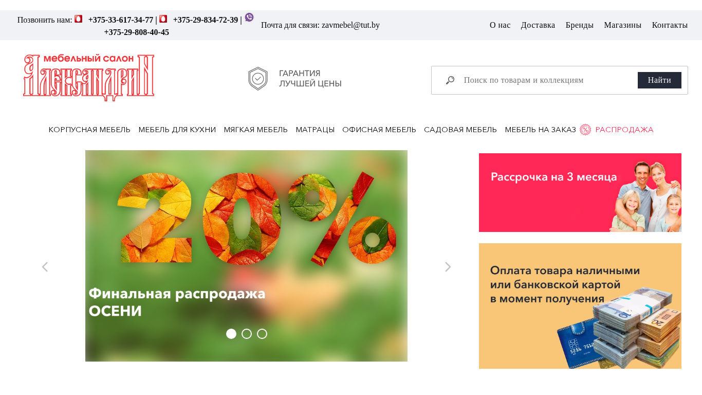 | AI-анализ | The website is an e-commerce platform selling various types of furniture with delivery services within Belarus. The title is missing, but the description mentions "собственная доставка" (own delivery) and "бесплатная доставка по стране" (free delivery across the country). The keywords include furniture brands, stores, contacts, and delivery. The top words are "мебель" (furniture), "доставка" (delivery), and "бренды" (brands). The company name, AlexandriN-Торг, is mentioned several times. The website offers a wide range of furniture categories such as corpus furniture, kitchen furniture, soft furniture, office furniture, and garden furniture. There is also a mention of a consultation service. The website has been in business for over 15 years and offers products directly from over 80 Belarusian |