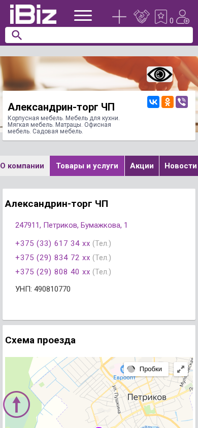 | AI-анализ | The web project "Александрин-торг ЧП" (ID: 490810770) is a Belarusian e-commerce website selling various types of furniture, including kitchen furniture, soft furniture, office furniture, and garden furniture. The company is located in Petrikov, at the address Бумажкова, 1. The contact information for the company includes three phone numbers: +375 (33) 617 34 xx, +375 (29) 834 72 xx, and +375 (29) 808 40 xx. The website offers furniture for purchase and provides information on company news, promotions, and job vacancies. The company's products and services are categorized under "Мебель" (Furniture) in the Yandex Business |