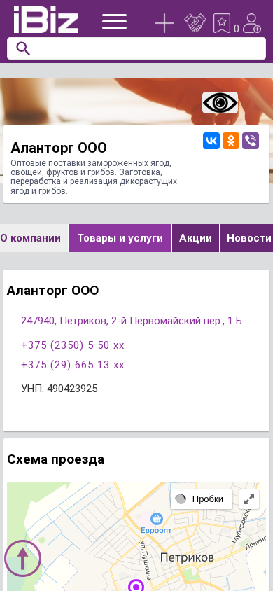 Название / ЗаголовокАланторг ООО - Оптовые поставки замороженных ягод, овощей, фруктов и грибов. Заготовка, переработка и реализация дикорастущих ягод и грибов.. 247940, Петриков, , 2-й Первомайский пер., 1 Б