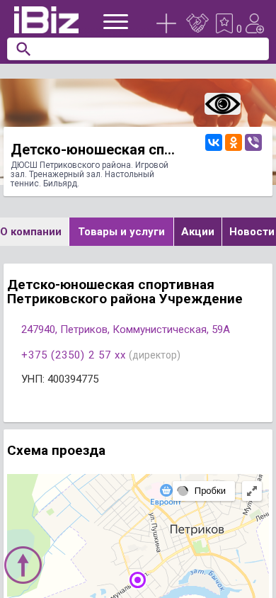 | AI-анализ | The portal is a sports institution for the Petrikov District called DYUSH Petrikovski Raiona. It features a game hall, a fitness center, table tennis, and billiards. The address is 247940, Petrikov, Kommunisticheskaya, 59A. The company's UNP number is 400394775. The contact information includes a phone number +375 (2350) 2 57 xx for the director. The operating hours are Monday to Friday from 9:00 to 18:00 without lunch and Saturdays and Sundays are closed. |