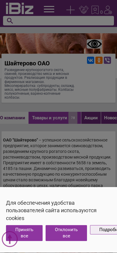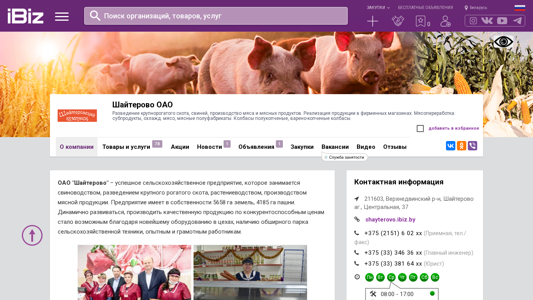 | AI-анализ | This website is dedicated to OAO (Open Joint Stock Company) "Shayterovo," a farming enterprise based in Belarus. The company specializes in livestock farming, specifically raising large livestock and pigs, as well as the production of meat and meat products. They also engage in meat processing, producing sub-products, chilled meat, and meat semi-finished products. Furthermore, they offer various types of sausages, including partially cooked and cooked-and-smoked ones. The address for this business is 211603, , Shaiterovo village, Central Street, 37. |