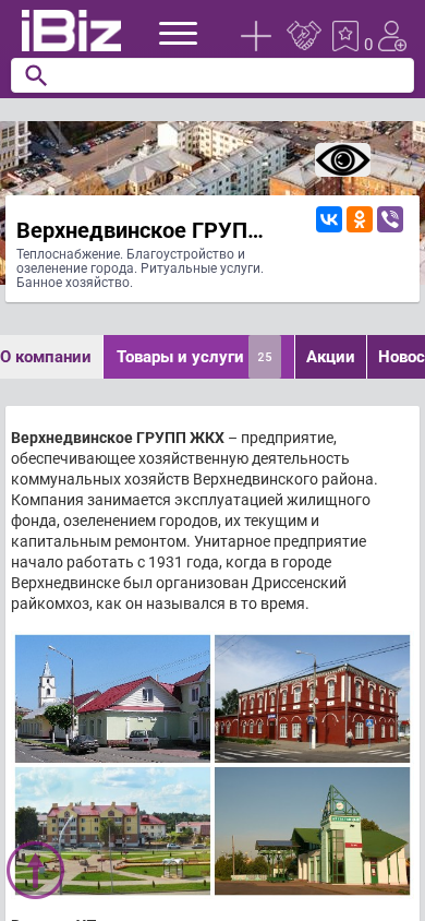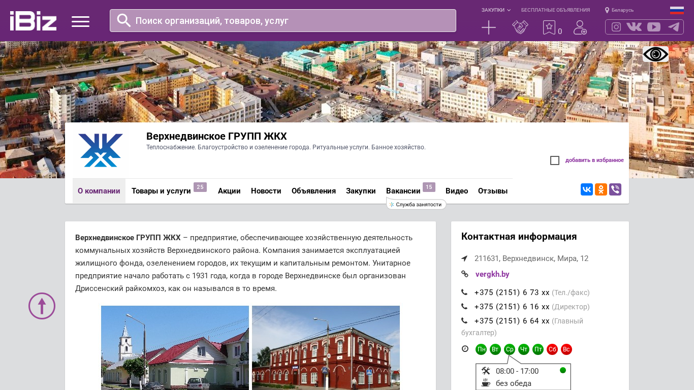 | AI-анализ | This website is for Verhneдвинское ГРУПП ЖКХ, a company based in Verhneдvinsk, Belarus, that provides communal services including heating, city improvement, and ritual services. The company, which has been in operation since 1931, manages the residential infrastructure, maintains and repairs cities, and offers various services such as boiler houses, water supply, sewage, and guest houses. Additionally, they provide funeral services and rental of bathhouses and guesthouses. The website includes a map for directions, contact information, and news, advertisements, and vacancies. Services offered by the company include water and heat supply, sanitation, technical maintenance, rental of bathhouses and guesthouses, funeral services, water meter installation, and construction and transportation services. Verhneдвинское ГРУПП ЖКХ |