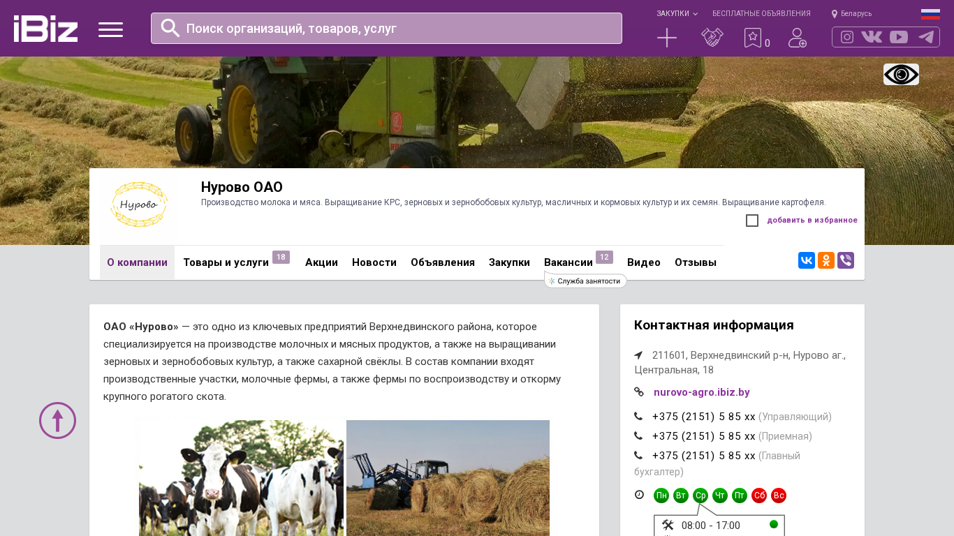 The portal Nurovo OAO is a Belarusian agricultural company specialized in milk and meat production, as well as farming of crops such as cereals, legumes, oilseeds and their seeds, and potatoes. The company's address is 211601, Nurovo ag., Centralnaia, 18. Their production includes milk, beef, cereals, legumes, oilseeds, potatoes, and related equipment for pressing hay. The company employs dedicated and knowledgeable staff who care for their livestock and have deep expertise in agriculture. Nurovo OAO aims to provide affordable prices and cater to individual client needs. The website offers various services and products related to agriculture, including purchasing announcements and vacancies. Domain: nurovo-agro.ibiz.by