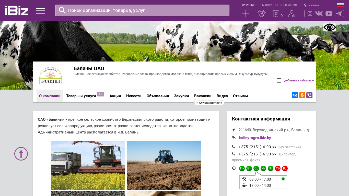 | Название / Заголовок | Балины ОАО - Смешанное сельское хозяйство. Разведение скота, производство молока и мяса, выращивание яровых и озимых культур, кукурузы.. 211640, , Балины д. |
