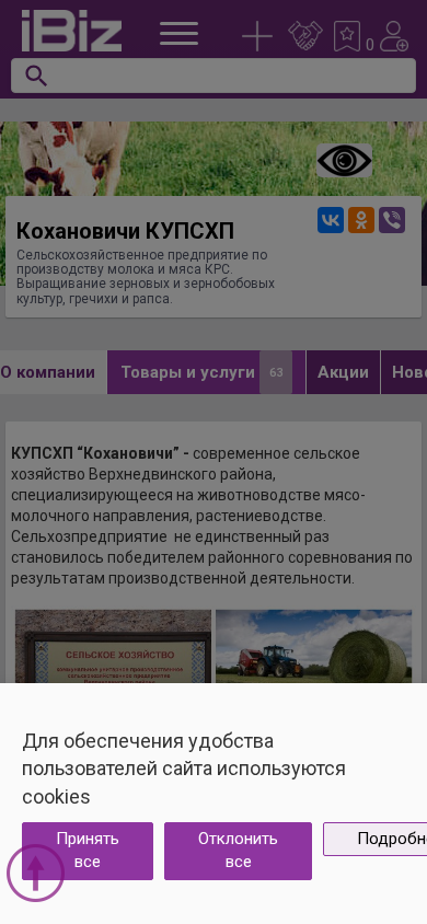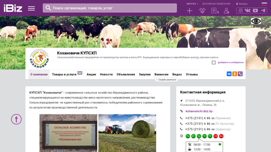 | AI-анализ | This website is for "Кохановичи КУПСХП," a farming enterprise in Belarus that focuses on milk and meat production from cattle (КРС) as well as farming of grains, beans, corn, and rapeseed. The company's address is in the village of Кохановичи, Lenina Street, 36. No specific contact information is provided in the given data. The website offers free classified ads for purchases. The main agricultural activities of the enterprise are livestock farming, particularly milk and meat production, and crop farming, with a focus on grains, beans, corn, and rapeseed. The enterprise has over 3,500 livestock, including around 1,200 cows, and their daily milk production is nearly 15 kg per cow. The enterprise ensures high-quality agricultural products and competitive prices. Potential partners are |