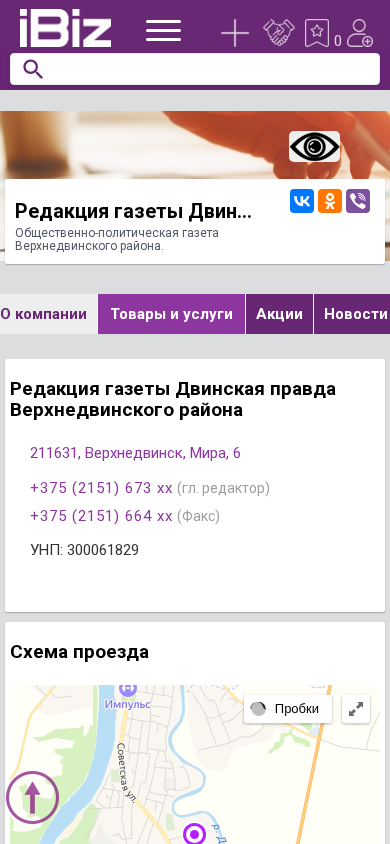 | AI-анализ | This website is the online presence of the editorial office of the Dvinskaya Pravda newspaper in the VerhneDvinsk region, which is a socio-political newspaper. The website provides contact information, including a street address, phone numbers, and a fax number for the editorial office, located at 211631, VerhneDvinsk, Mir, 6. The website features sections for various categories such as free announcements, company information, goods and services, newspapers and journals, internet publications, actions and news, vacancies, video, and reviews. The website also includes a map and instructions for reaching the editorial office. The business registration number (UNP) for the organization is 300061829. The website operates from Monday to Friday from 8:00 AM to 5:00 PM, with a break from |