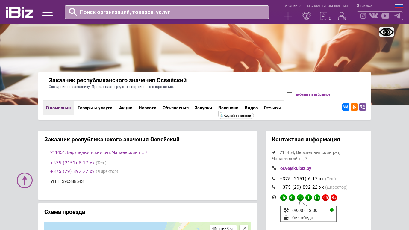 | SEO-описание | Заказник республиканского значения Освейский - Экскурсии по заказнику. Прокат плав.средств, спортивного снаряжения.. Схема проезда, контактные телефоны, адрес компании Заказник республиканского значения Освейский. 211454, , Чапаевский п., 7 |