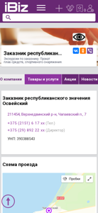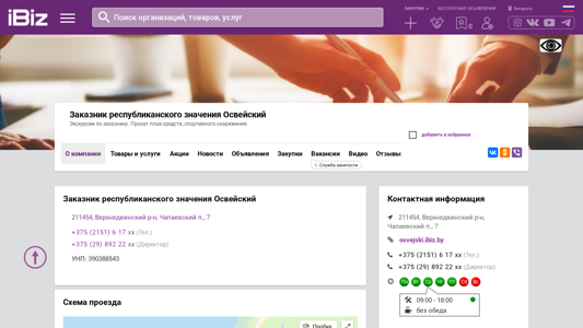 | AI-анализ | The web project "Osveyski.ibiz.by" is a nature reserve company located in Chaapaevsky district, Verkhne-dvin region, Belarus. The company offers ecotours and equipment rentals for watercraft and sports gear. Contact information and a map scheme are provided on the website. The company specializes in eco, agro and green tourism. Services are available from Monday to Saturday, without lunch breaks. The company's director's contact information is also provided. The website includes sections for news, announcements, vacancies, videos, and customer reviews on social media platforms VKontakte and Odnoklassniki. The company is listed under the categories of eco, agro and green tourism in Verkhne-dvinsk. The contact details and opening hours are: +375 (2151) 6 17 x |