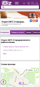 The website is for the Civil Registry Office (ZAGS) of Starodorozhsky Ray Executive Committee in Belarus. It provides information on the office's location, contacts, and operating hours. Users can also find schemes for reaching the office, as well as add the office to their favorites. The website includes sections for company information, products and services, news, announcements, vacancies, and user reviews on social media platforms. The office's contact information includes a phone number and address. The operating hours are Monday to Friday from 9:00 am to 6:00 pm without lunch breaks. The website is in the "Organizations of Civil Registry Offices in the Old Towns" category and is operated by OOO "AIBIZ MEDIA" - the catalog of enterprises and organizations in Belarus.
