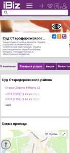 This website belongs to the Starodorozhsky District Court in Belarus, which focuses on protecting the rights and freedoms of individuals, social and economic, and political rights of citizens, and the constitutional order of the Republic of Belarus, state and public interests. The address and contact information for the court are provided, along with a map scheme for reaching the location. The website offers various services related to the court, including free classifieds, and includes sections for companies, goods and services, news, and announcements. The court's hours of operation are listed as Monday through Friday, from 9:00 AM to 6:00 PM, with no breaks for lunch. The website also includes a public agreement and user agreement.