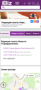 | AI-анализ | The website is for the editorial office of the newspaper "Novosti Starodorozhchin" of the Starodorozhsky district in Belarus. It provides information about the newspaper, including its address and contact telephone numbers. The website also features sections for classified ads, including free ads, as well as a section for company listings. The website is part of Aybiz Media OOO, a media organization based in Belarus. The website is accessible from Monday to Friday from 9:00 to 18:00 without lunch breaks, and on Saturdays and Sundays it is closed. The contact information for the advertising department and correspondents is provided. The website includes a map and directions to the editorial office, as well as information about traffic conditions and a contact form for reporting errors. The website is categorized under "Newspapers and Journals, Internet Publications" and also |