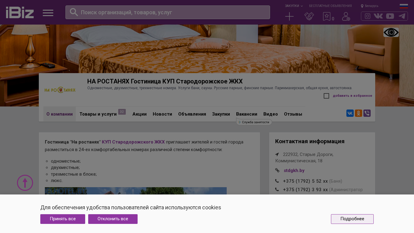| Название / Заголовок | НА РОСТАНЯХ Гостиница КУП Стародорожское ЖКХ - Одноместные, двухместные, трехместные номера. Услуги бани, сауны. Русские парные, финские парные. Парикмахерская, общая кухня, автостоянка.. 222932, Старые Дороги, , Коммунистическая, 18 |