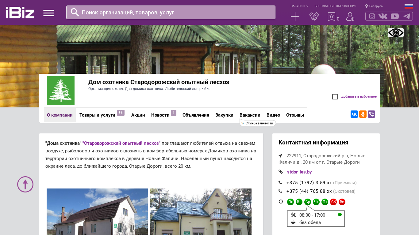 | AI-анализ | The portal 'Dom ohotnika (Starodorzhsky oпытный лесхоз) - Organization of hunting. Two hunter's cabins. Amateur fishing.. 222911, , New Falychi d., 20 km from the city of Starye Dorogi This website is dedicated to 'Dom ohotnika (Starodorzhsky oпытный лесхоз)' or the 'Starodorzhsky experimental forestry' that offers hunting, two hunter's cabins, and amateur fishing opportunities. The location is in the village of New Falychi, which is 20 km away from the city of Starye Dorogi. The website includes a map for directions, contact phone numbers, and the address of the company. The cabins offer accommodations with all the necessary amenities for more than 3 |