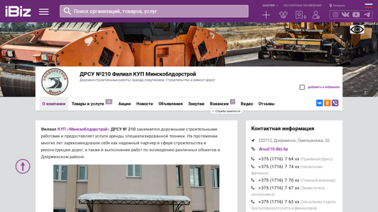 The website is for the filial branch of KUP Minskoblodorstroy, designated as DRSU #210. It specializes in road construction and repair works, as well as renting specialized equipment. The company has been a reliable partner in the construction and reconstruction of roads, and the execution of various projects in the Dzerzhinsk region for many years. DRSU #210 is responsible for maintaining 757.5 kilometers of local roads. The company prioritizes high-quality standards and applies modern technologies for the durability and safety of the road surface. Current services include the construction of new roads, repair of existing pavement, infrastructure network development, equipment rental, and various construction and repair projects of different complexities. The availability of a large fleet of specialized equipment, including excavators, tractors, loaders, bulldozers, graders,