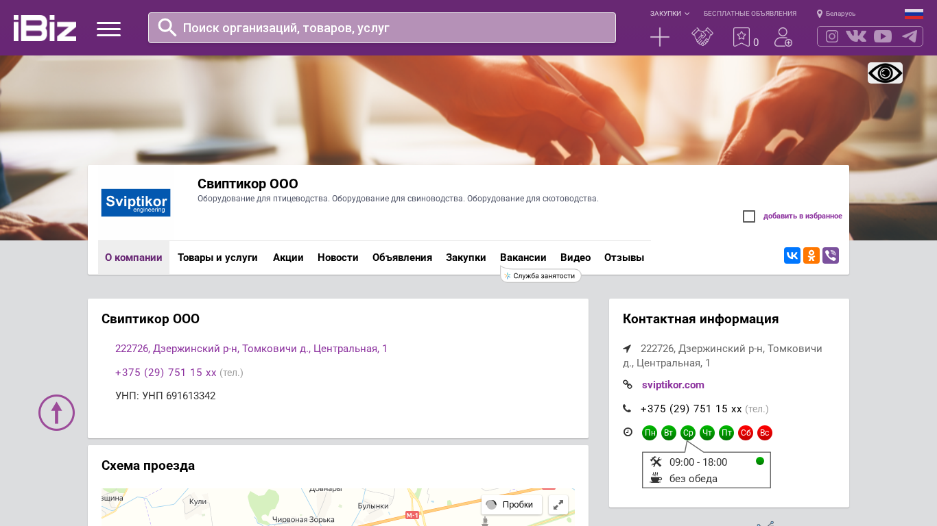 The portal Sviptikor OOO offers equipment for poultry farming, pig farming, and cattle farming. The company's contact information, including address, phone numbers, and a map scheme for reaching the location, is provided. 222726, Tomkovichi d., Centralnaia, 1, Dzerzhinsky district. Services and products include farm machinery and agricultural equipment. The company operates Monday through Friday from 9:00 am to 6:00 pm, with Saturdays and Sundays being closed. The contact person's name and position are also listed.