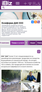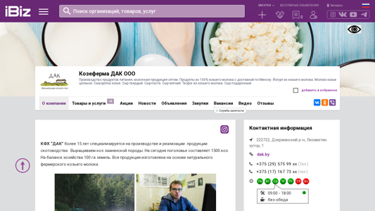 | AI-анализ | This website is a Belarusian dairy farm, 'Козеферма ДАК ООО', that specializes in the production and sale of dairy products in bulk. All products are made from 100% goat's milk and are delivered to Minsk. The offerings include yogurt, whole goat's milk, whey, hard cheese, cheese paste, soft cheese, and cottage cheese. The farm has been in operation for over 15 years and farms over 100 hectares of land with a herd of 1500 goats of the Zanesian breed. Their products are popular and widely distributed through various retailers such as 'Гиппо', 'Грин', 'Бигсс', 'Алми', 'Рублевский', 'Евроопт', and Komarovsky Market. The |